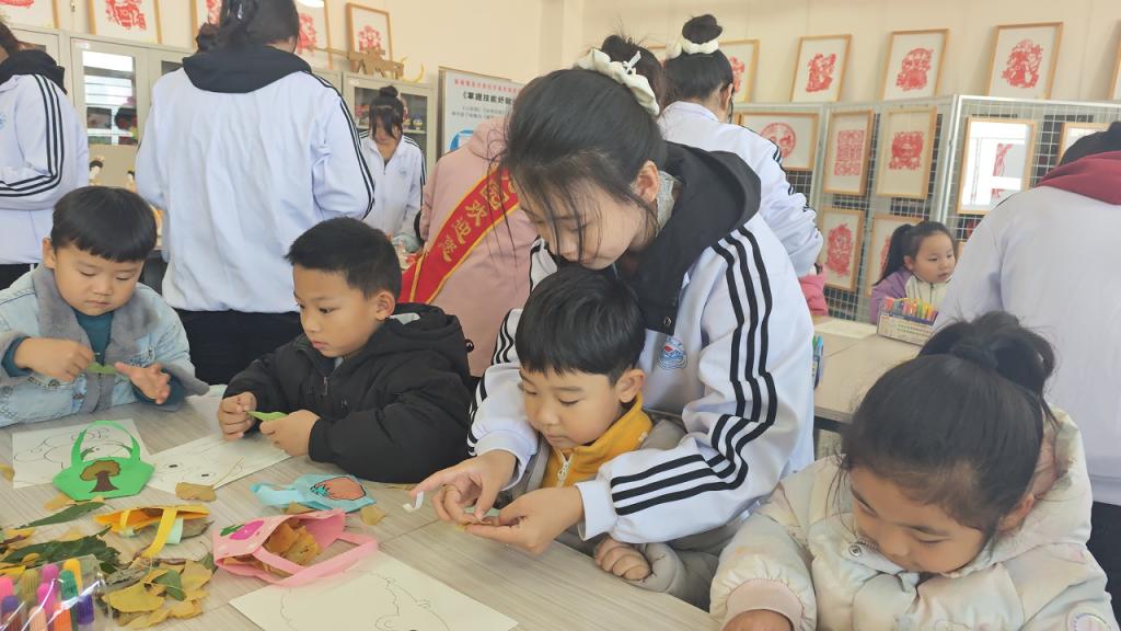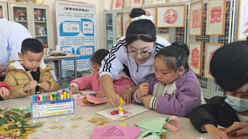 研学最后一站,学前教育学院手工实训室内,志愿者指导孩子们用拾捡的秋叶创作秋景作品。孩子们发挥想象,动手绘画制作,既锻炼了实践能力,更学会以艺术视角发现美、表达美,将研学记忆定格,实现审美素养与创造力的双重提升。
