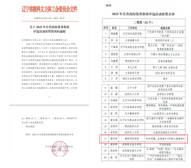 近日,辽宁省教科文卫体工会委员会公布了《关于2025年全省高校优秀教案评选活动获奖情况的通报》,我院梁许彤老师的《知礼明德,品润童年—学前儿童德育》教案荣获二等奖。这是我校在该项省级赛事中首次获奖,彰显了学前教育学院在学前教育专业教学改革与课程建设中的显著成效。