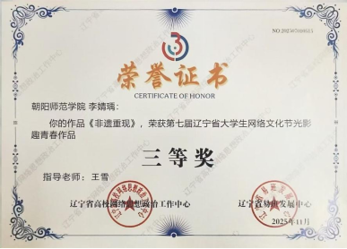 近日,第七届辽宁省大学生网络文化节及全省高校网络教育优秀作品推选展示活动结果揭晓,我院师生斩获二等奖、三等奖各1项。