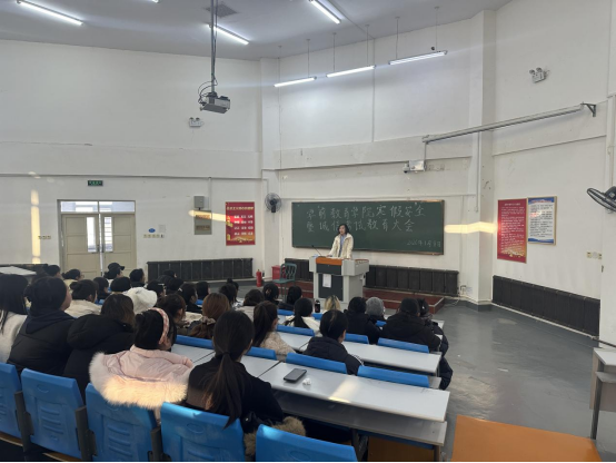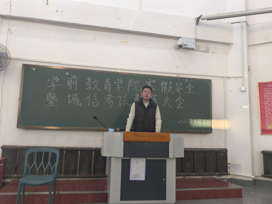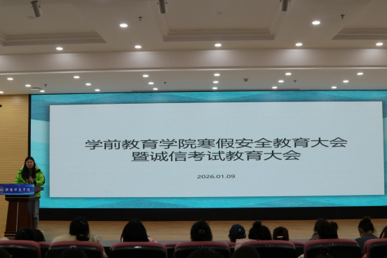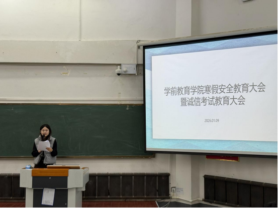 为切实增强学生安全防范意识,筑牢假期安全防线,同时端正考风考纪,营造诚信应考的良好氛围,学前教育学院于2026年1月8日至9日,分批次组织召开了寒假安全教育大会暨诚信考试教育大会,学院全体学生按计划分批参会,会议由学院党总支副书记及辅导员主持。