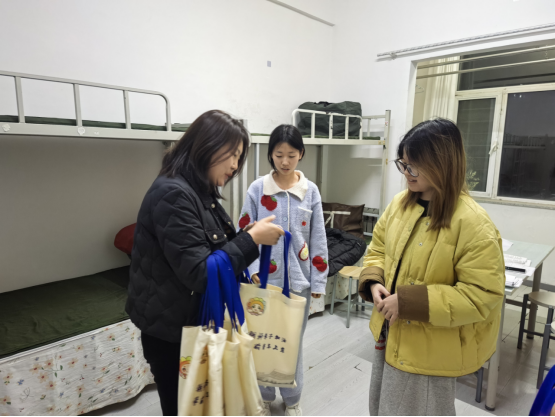 走访过程中,康鑫鑫副书记与全体辅导员走进所有专升本的学生宿舍,亲手将一份份满载心意的“升本加油包”送到每位同学手中。老师们与同学们亲切交流,耐心询问大家近期的复习进度、备考状态以及日常生活需求,细心倾听学子们在备考过程中遇到的困惑与压力,针对复习技巧、心态调整等问题给出专业建议,并进行针对性的心理疏导,鼓励大家放平心态、坚定信念、从容应考。